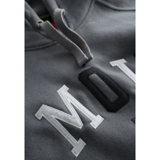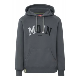 Dunkelgrauer Kapuzenpullover für Herren mit aufgesetztem Moin-Schriftzug und Tunneltasche.