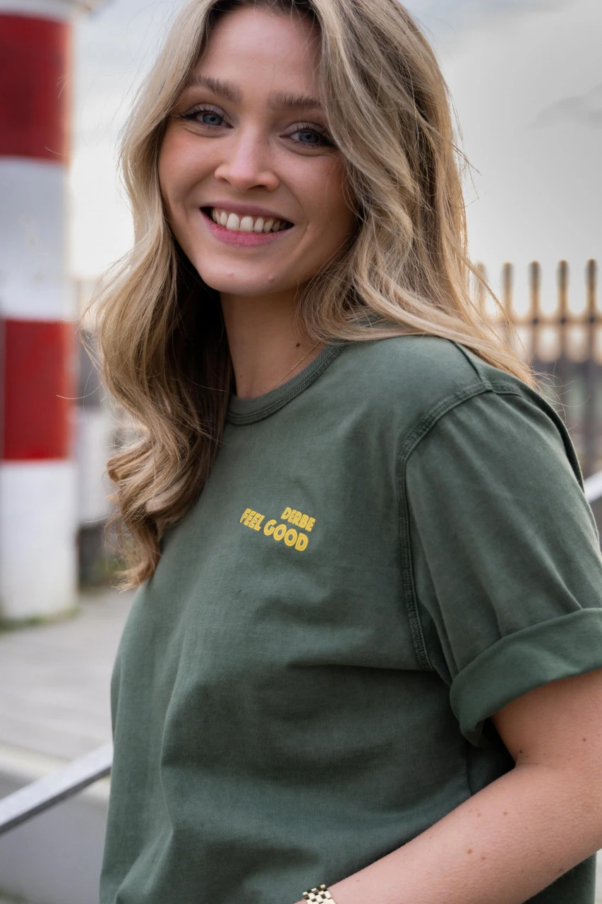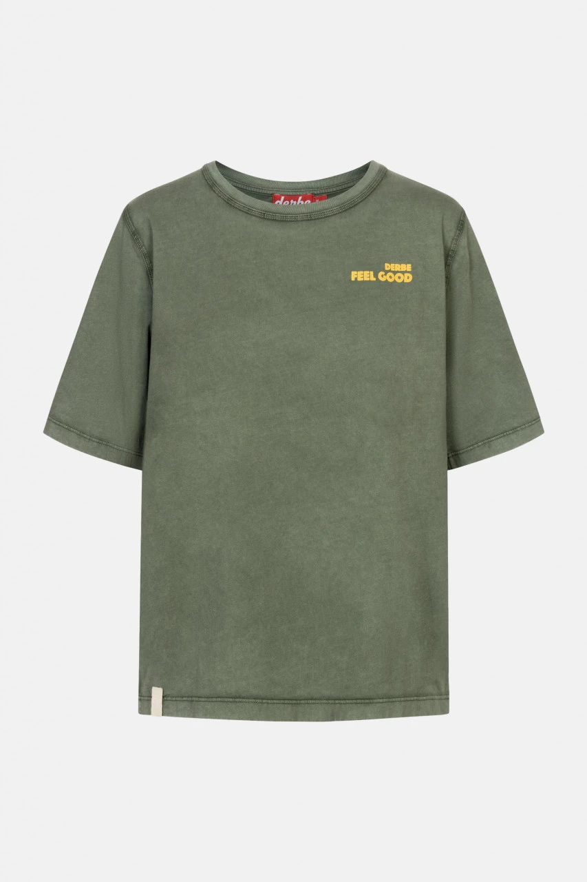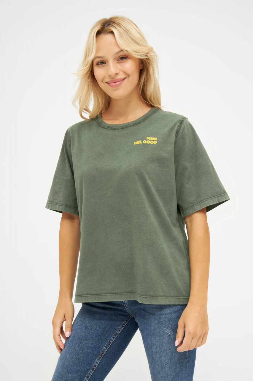 Grünes T-Shirt von Derbe für Damen mit Feel-Good Print auf der Brust und großem Robbensmiley auf dem Rücken. Zaubert garantiert ein Lächeln auf die Gesichter eurer Mitmenschen!Nachhaltigkeit: